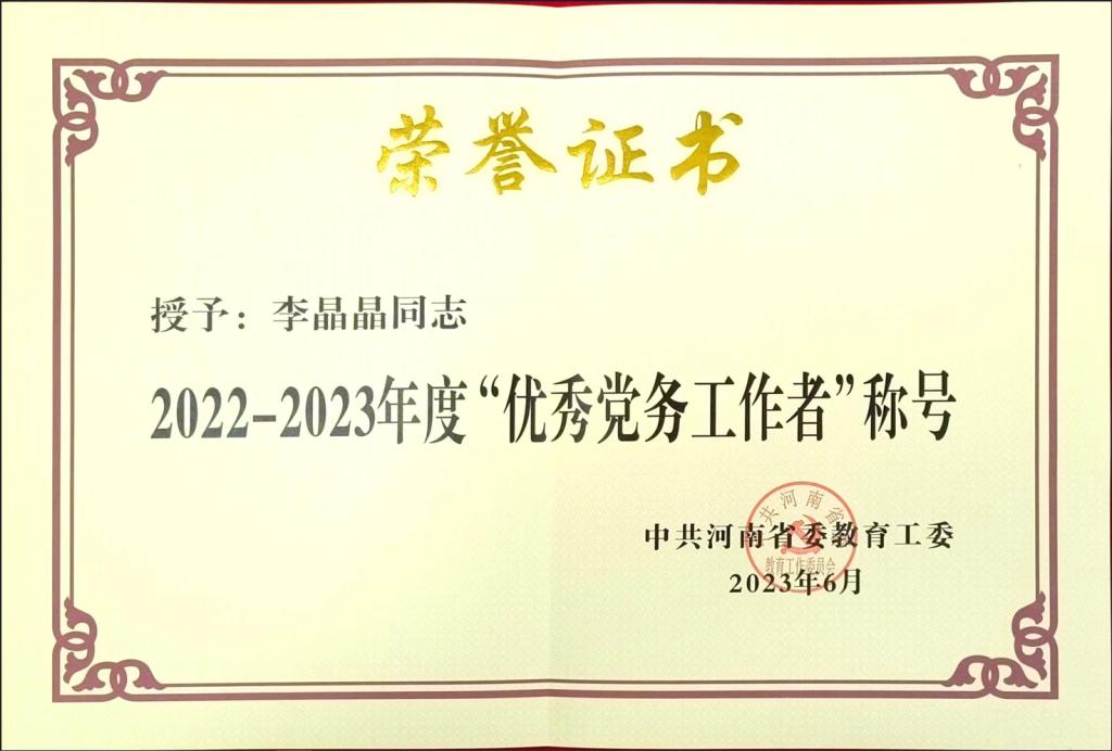 近日,省委教育工委公布了委属学校优秀共产党员、优秀党务工作者、先进基层党组织评选结果。无码测量工程系党支部荣获“河南省先进基层党组织”、李晶晶同志荣获“河南省优秀党务工作者”荣誉称号。全省共表彰200名优秀共产党员、100名优秀党务工作者和200个先进基层党组织。