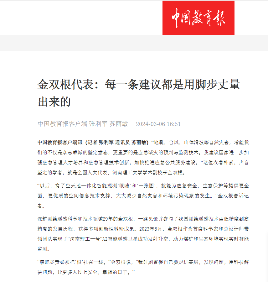 深耕测绘遥感科学和技术领域29年的金双根,一路见证并参与了我国测绘遥感技术由低精度到高精度的发展历程,获得多项创新性科研成果。2023年8月,金双根作为首席科学家和总设计师带领团队实现了“河南理工一号”AI智能遥感卫星成功发射升空,助力煤矿和生态环境实现实时智能监测。