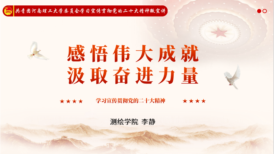 李静以“感悟伟大成就 汲取奋进力量”为主题,从党的二十大报告主题、新时代十年伟大变革和历史成就、弘扬奋斗精神,做新时代奋斗者等方面进行宣讲,通过中国高度、中国速度、中国跨度等不同维度向同学们展示新时代十年党和国家事业取得的历史性成就、发生的历史性变革,带领大家学习习近平总书记到河南安阳红旗渠考察时发表的重要讲话,号召同学们弘扬奋斗精神,汲取奋进力量,勇做走在时代前列的奋进者、开拓者、奉献者,把奋斗精神体现在实际行动中,把青春热血镌刻在历史的丰碑上。