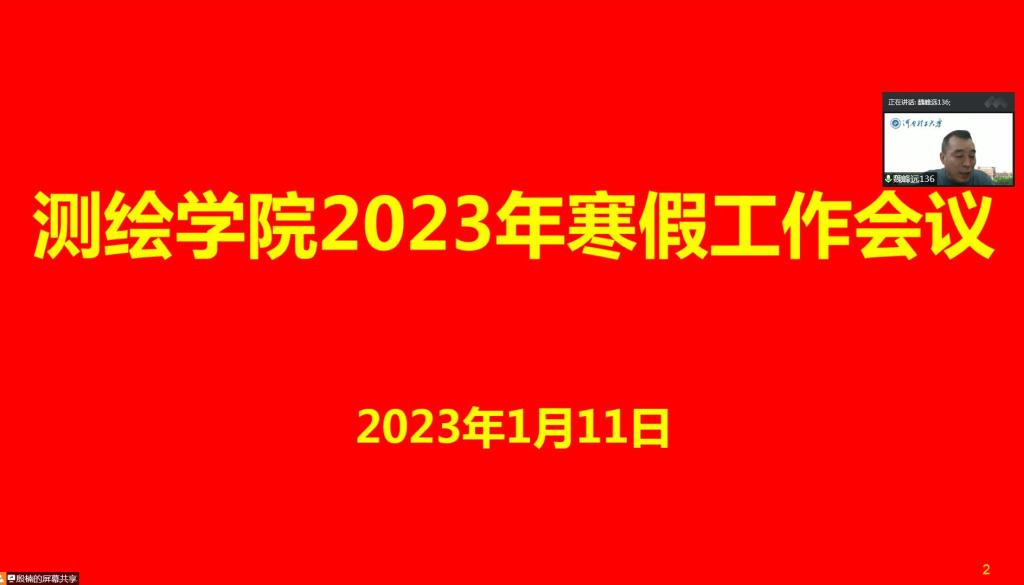 寒假工作进行了安排部署。他要求,各系、室要充分利用假期,深入谋划2023年重点工作,尤其是一流专业的建设;要充分利用假期时间做好各类项目申报、验收及成果鉴定等工作;任课教师要做好本科和研究生成绩提交以及教学资料归档工作;研究生导师要指导和督促研究生按时完成学位论文的撰写,把好学位论文质量关;根据学校教学安排,做好下学期开学教学准备,尤其是遗留实习和课程考试要及时补齐;做好本科审核评估和学位点评估准备,以及测绘工程专业认证工作准备。