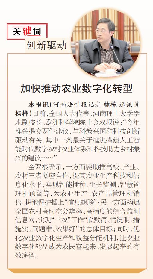 河南法制报:全国人大代表金双根【关键词】创新驱动 加快推动农业数字化转型