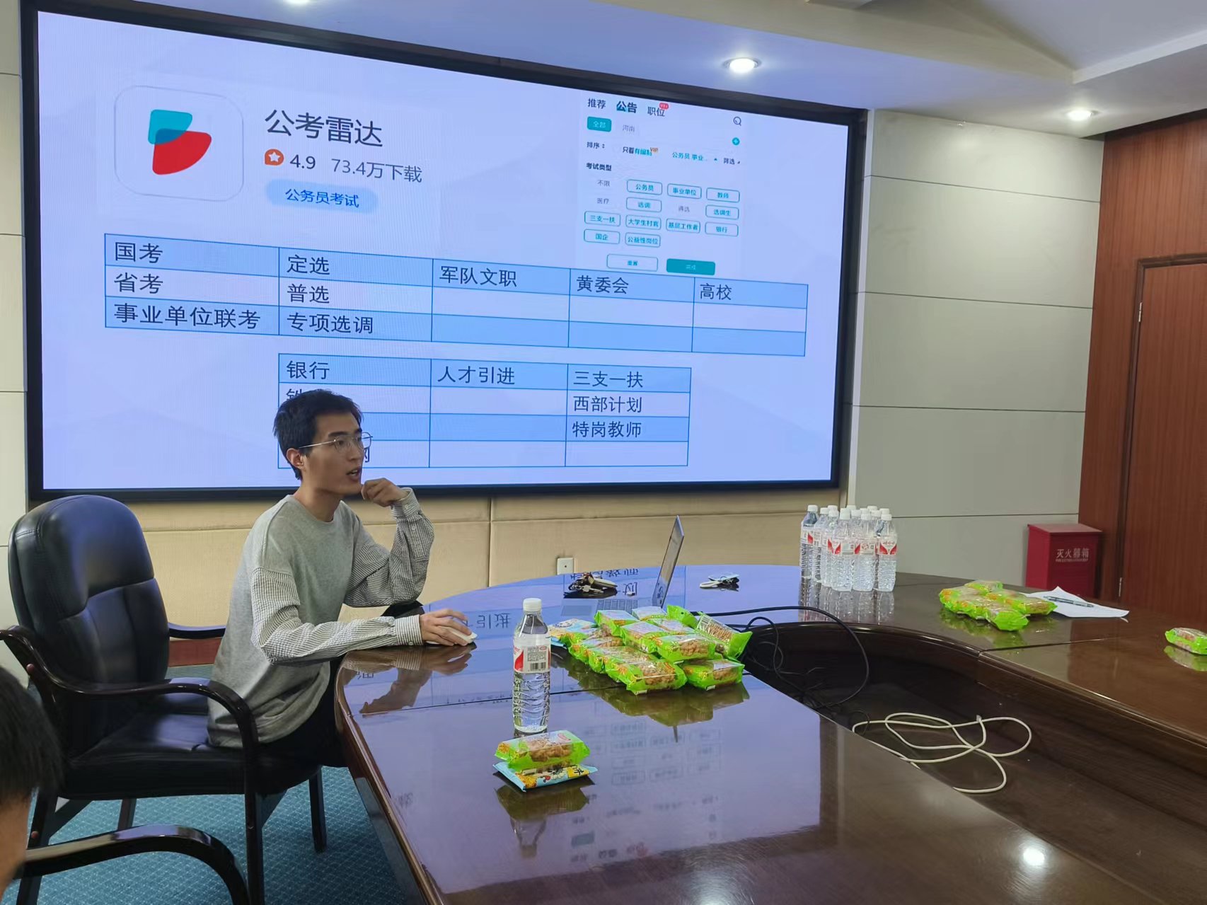 周鹏学长首先介绍了自己的个人申博情况,接着他从申博的原因、选择、过程以及信息四个方面,以自己的经验为例告诉大家应该如何确定目标,丰富自己的履历以及及时获取申博信息等内容。管鹏举学长以自己的考公经历出发,为大家讲解了公务员考试的类型、考试时间、笔试内容与题型、面试内容与准备等方面。他强调大家在复习过程中一定要合理分配时间,兼顾好行测与申论的复习。刘远航学长则重点讲解了国考省考、事业单位联考、定向选调等考公考编类型的笔试异同点以及招聘岗位的契合度等内容。并且,他建议大家一定要提前练好字,一手好字也是成功上岸的关键之一。交流答疑环节中,同学们针对自己目前的疑惑进行了提问,学长们逐一进行耐心解答。