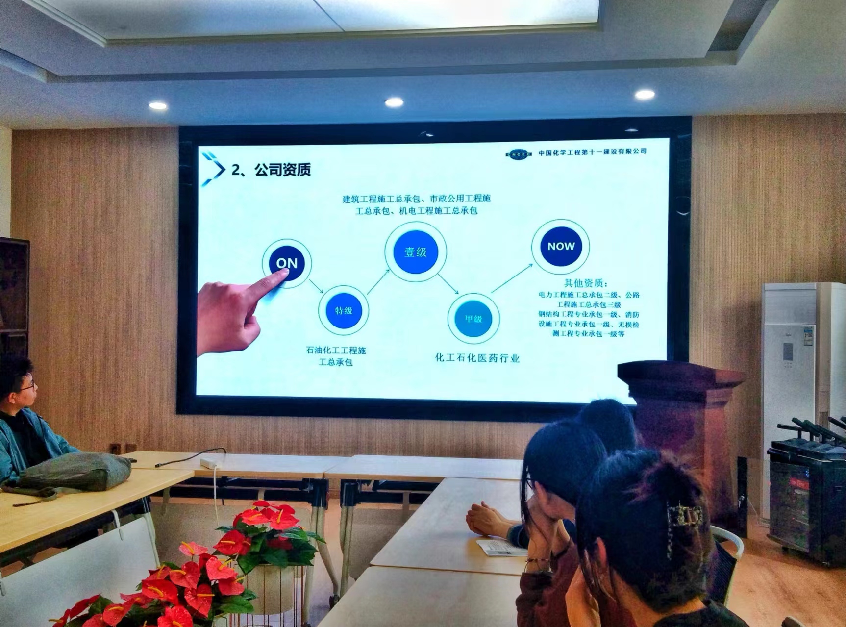 联合中国化学工程第十一建设有限公司在测绘综合楼二楼会议室举行专场招聘会。本次会议参会人员有20级辅导员李瑜婷、中国化学工程第十一建设有限公司闫经理、20级测绘工程、遥感专业毕业生。
