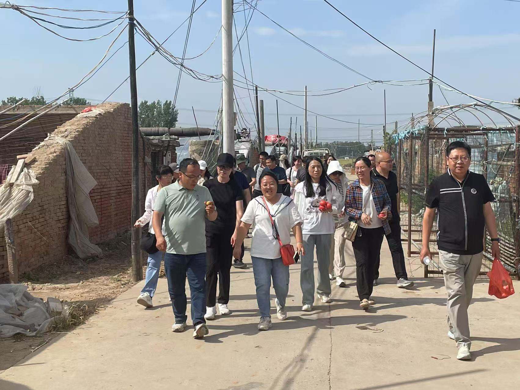 赵郭村驻村第一书记李翔海热烈欢迎大家的到来,邀请大家品尝特色农产品,并向院系教职工详细介绍了村子发展情况与未来规划目标,让大家对赵郭村的发展有了更加直观的认识。随后,教职工进入果蔬采摘园,体验采摘果蔬的乐趣。在摘取之余,园主为大家介绍了赵郭村黄瓜、西红柿、西兰花与茄子等瓜果蔬菜的种植历史以及品质鉴别方法,并邀请大家体验半地下人工大棚特色种植方式,加深了教职工对农村果蔬种植的了解。采摘过程中,工会成员相互协作,整个采摘过程欢声笑语,其乐融融,收获满满。