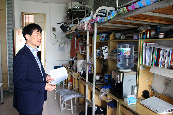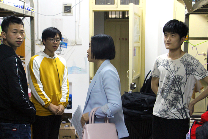 检查过程中,老师就宿舍用电及卫生问题进行了着重排查,严查违规电器,私拉电线,离寝未断电等高危现象,并嘱咐同学在天气转暖的季节要注意宿舍清洁,勤通风换气,以避免细菌的滋生。期间,老师们询问同学们的学习情况及生活中的问题,并给出了切实可行的建议,他们叮嘱同学们大学正是积累知识的阶段,要充分利用大学丰富的资源,武装自己的头脑;老师们也询问了大四学生的考研结果以及就业问题。检查过程中,就同学们提出的疑问,老师们结合实际情况给予指导,同学们切实感受到师长的温暖。针对宿舍卫生差的情况,在老师语重心长的劝说下,同学们表示一定会爱护宿舍卫生,不使用违章电器,遵守宿舍规章制度,营造良好的学习生活氛围。