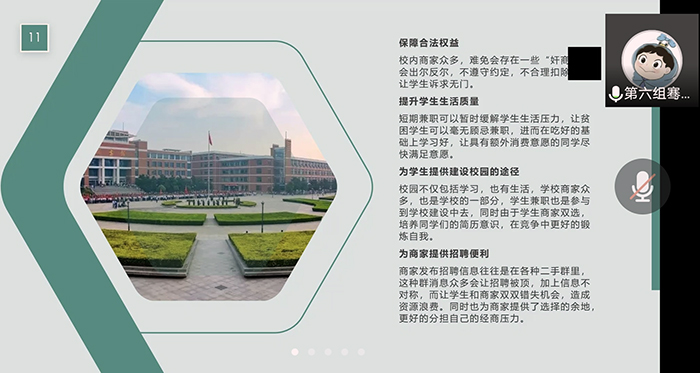 比赛伊始,生活权益部成员对本次提案大赛的流程和要求进行介绍,希望大家集思广益,积极参与,对学校各方面工作献言献策。比赛过程中,各小组成员从民生基建规划、教育教学改革、校园文化建设、创新创业服务等各个方面针对存在问题,分析现状,并提出自己的解决方案,充分体现实用性、科学性、环保性,展现出诸多亮点。最终,“AED及相关急救措施”和“校医院疫情就诊问题”的提案脱颖而出,晋级校赛。