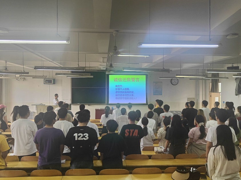 胡佰林首先介绍了国家助学贷款对学生在学业上所发挥的巨大作用,然后为同学们详细讲解了贷款毕业生必须掌握的贷款知识、毕业后还本付息安排、升学展期办理等程序,并对部分贷款毕业生关注的毕业前、后还款问题进行一一解答。随后,进行了有奖竞答活动,进一步加深了同学们对助学贷款的认识。最后,胡老师对贷款毕业生进行了诚信教育,他强调贷款毕业生按时还本付息是助学贷款业务持续发展的保证,希望同学们毕业后要以诚信为本,如期还款,并带领全体贷款毕业生进行了诚信还款宣誓。