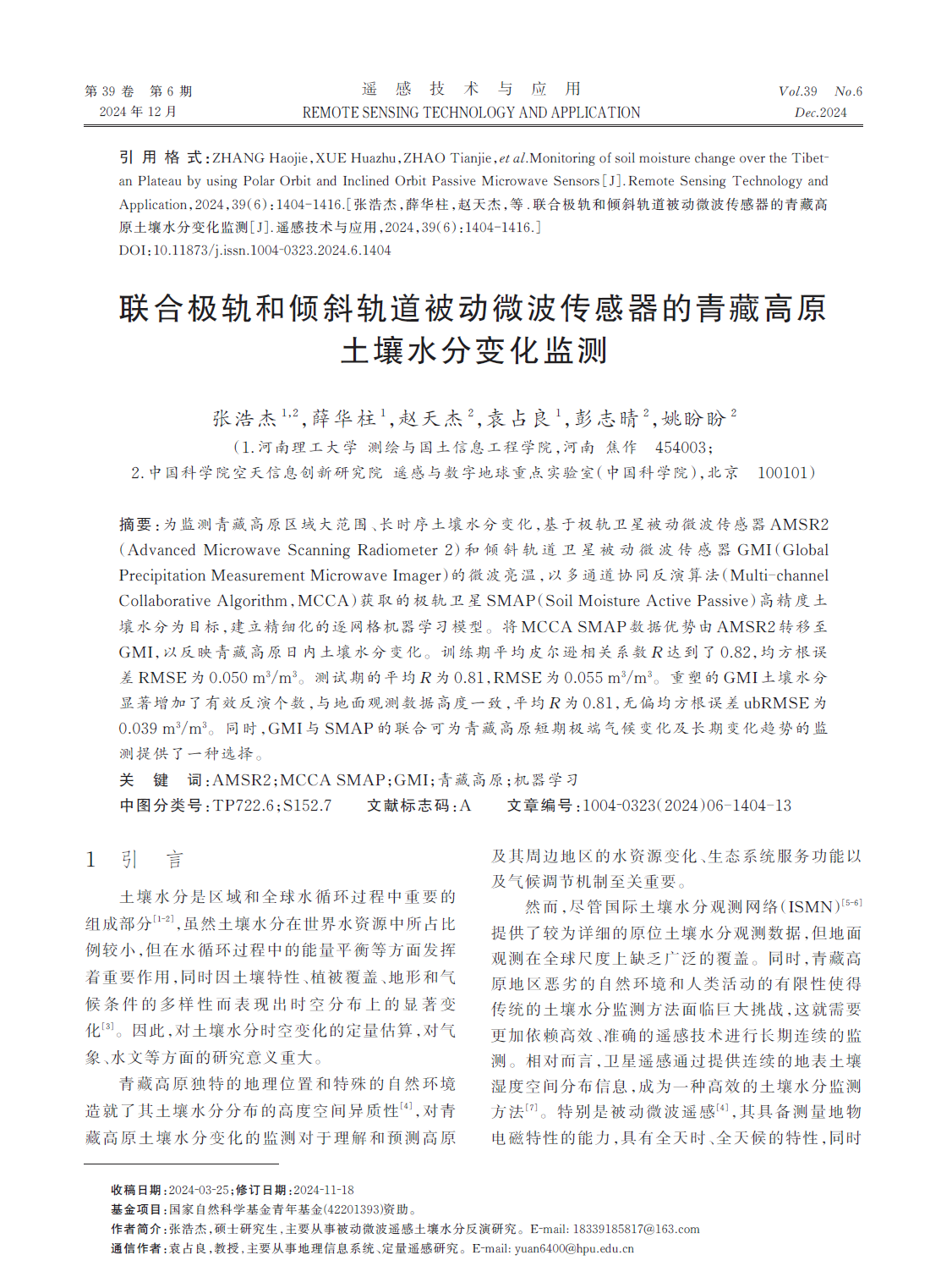 空天信息创新研究院赵天杰研究员等共同指导下,无码2021级测绘科学与技术硕士生张浩杰以第一作者身份在CSCD核心期刊《遥感技术与应用》(2024年第6期)发表题为《联合极轨和倾斜轨道被动微波传感器的青藏高原土壤水分变化监测》封面论文。论文通信作者为无码袁占良教授。