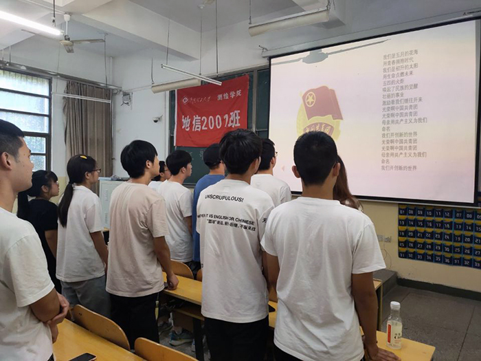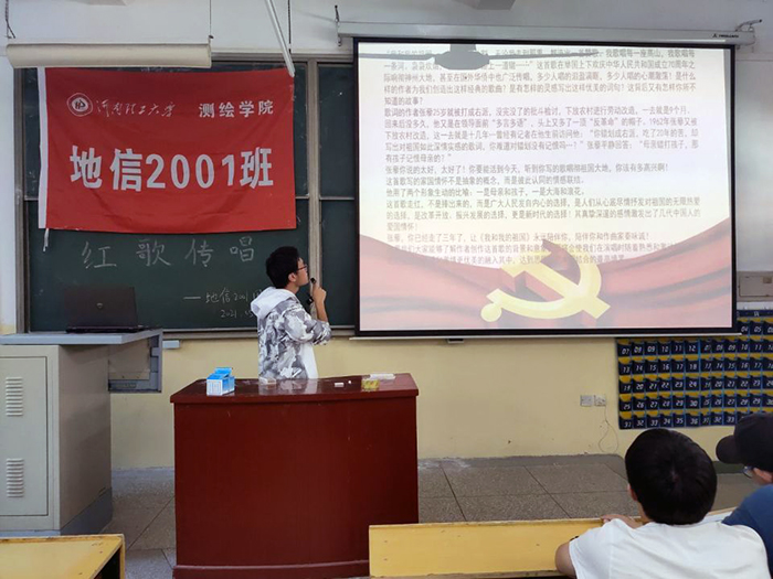 103教室组织了庆祝中国共产党成立100周年红歌传唱活动,从歌声中回味峥嵘岁月,陶冶家国情怀。活动由地信2001班班长、团支部副书记张杰主持。