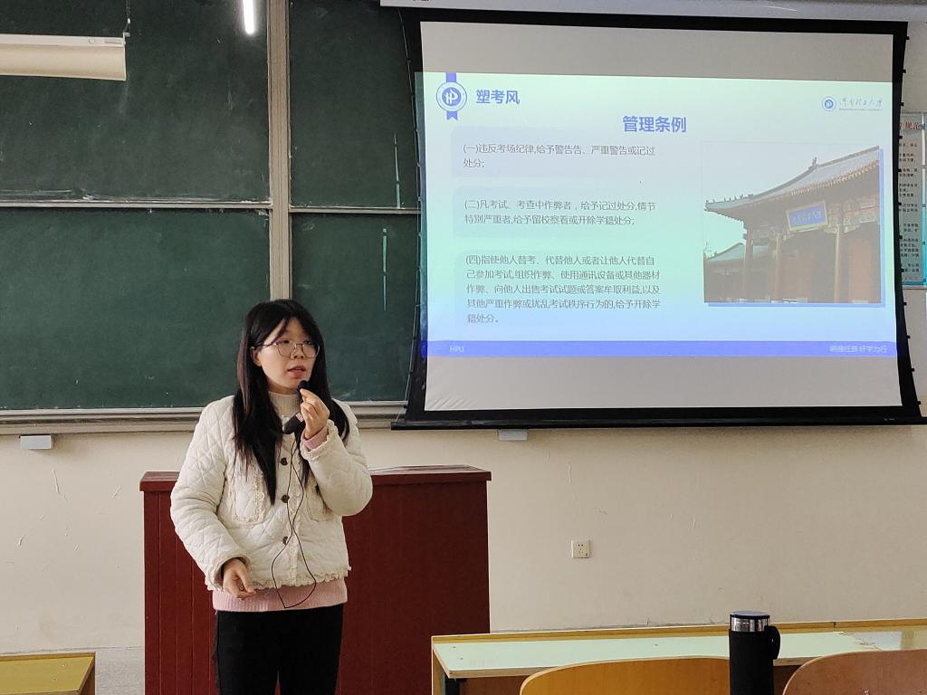 会上,副院长柴华彬结合自身经历阐述班级的班风、班纪对学生大学期间成长的重要性,强调同学们应以饱满的精神状态投入到期末考试复习中,遵守考场纪律,发扬诚信考试风气。随后,研管办主任谢玉娟再次提醒同学们切不可有侥幸心理,杜绝作弊行为,提醒学生要增强人身安全意识、提升自我保护能力,谨防各类诈骗行为。最后,班主任吴喜芳对本次主题班会进行总结,并倡导大家走出宿舍舒适区,提醒同学们加强身体锻炼,自律自强,提高学习效率;教育引导同学们要互帮互助,培养优良“班风、学风、考风”。